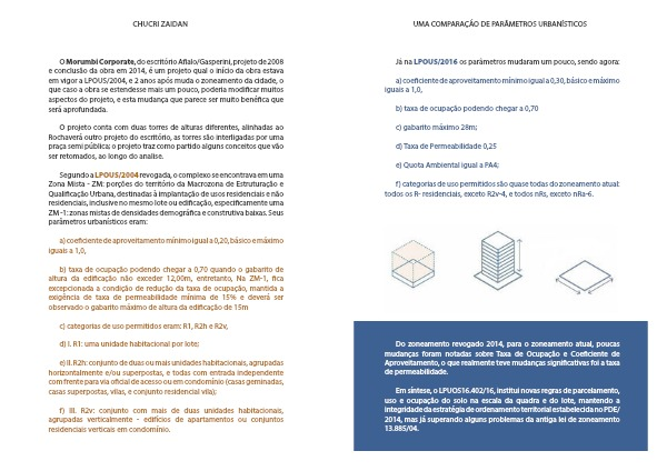 Do zoneamento revogado 2014, para o zoneamento atual, poucas mudanças foram notadas sobre Taxa de Ocupação e Coeficiente de Aproveitamento, o que realmente teve mudanças significativas foi a taxa de permeabilidade.