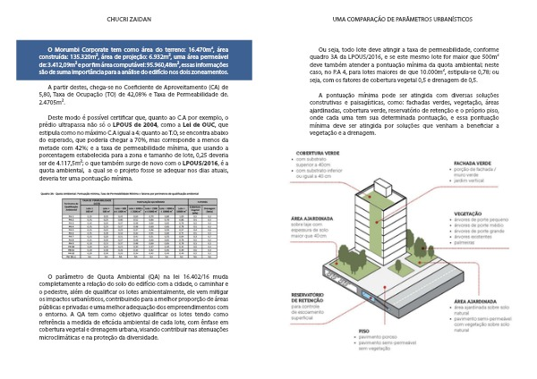 Deste modo é possível certificar que, quanto ao C.A por exemplo, o prédio ultrapassa não só o LPOUS de 2004, como a Lei de OUC, que estipula como no máximo C.A igual a 4; quanto ao T.O, se encontra abaixo do esperado, que poderia chegar a 70%, mas corresponde a menos da metade com 42%; e a taxa de permeabilidade mínima, que usando a porcentagem estabelecida para a zona e tamanho de lote, 0,25 deveria ser de 4.117,5m²; o que também surge de novo com o LPOUS/2016, é a quota ambiental, a qual se o projeto fosse se adequar nos dias atuais, deveria ter uma pontuação mínima.