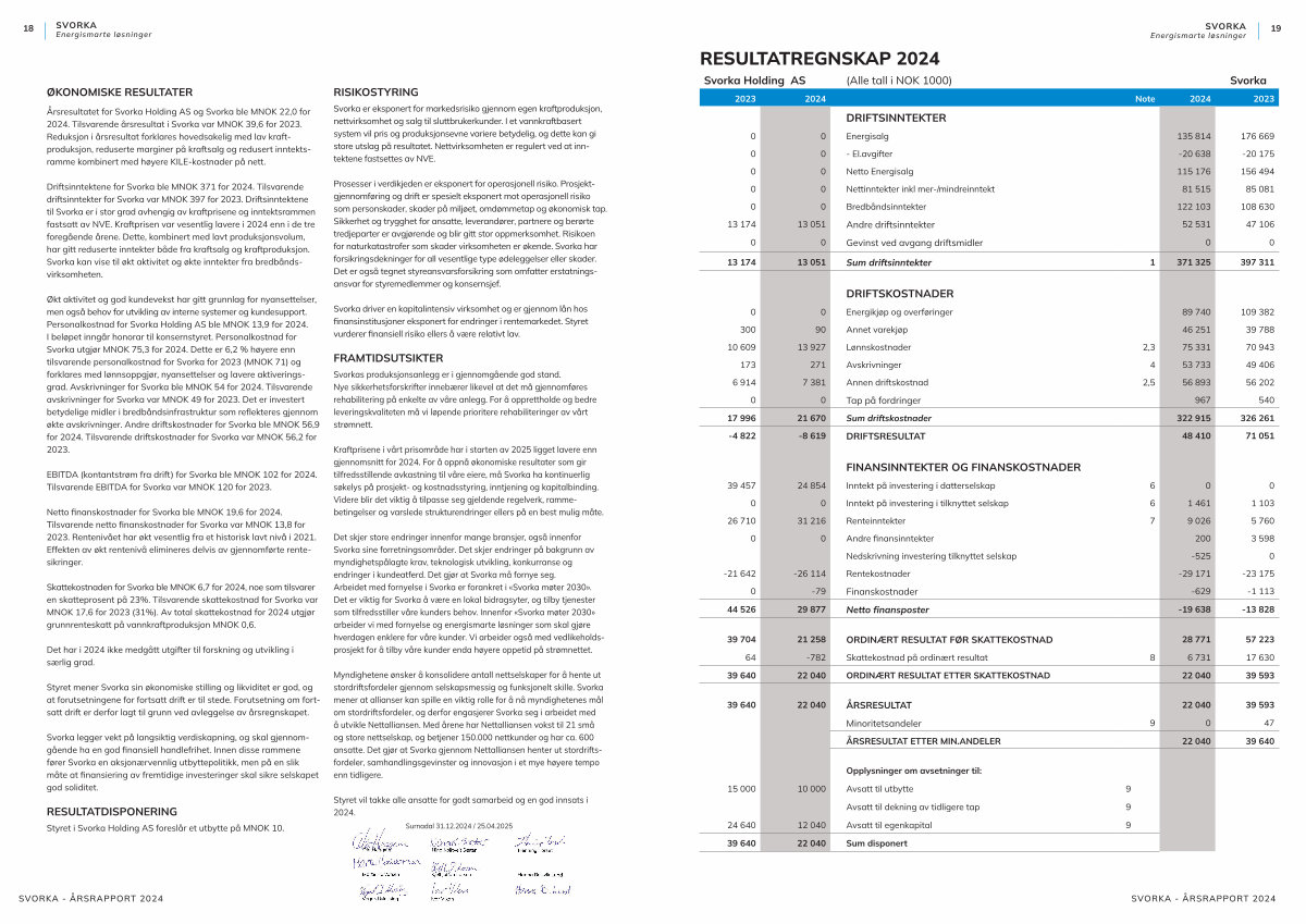 Årsresultatet for Svorka Holding AS og Svorka ble MNOK 22,0 for 2024. Tilsvarende årsresultat i Svorka var MNOK 39,6 for 2023. Reduksjon i årsresultat forklares hovedsakelig med lav kraftproduksjon, reduserte marginer på kraftsalg og redusert inntektsramme kombinert med høyere KILE-kostnader på nett.