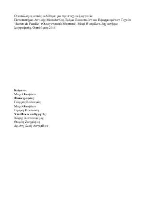 Ο κατάλογος αυτός εκδόθηκε για την πτυχιακή εργασία: Πανεπιστήμιο Δυτικής Μακεδονίας-Τμήμα Εικαστικών και Εφαρμοσμένων Τεχνών“ Secrets de Famille”( Οικογενειακά Μυστικά), Μαρί Θεοφίλου, 3ργαστήριο ζωγραφικής, Οκτώβριος 2016