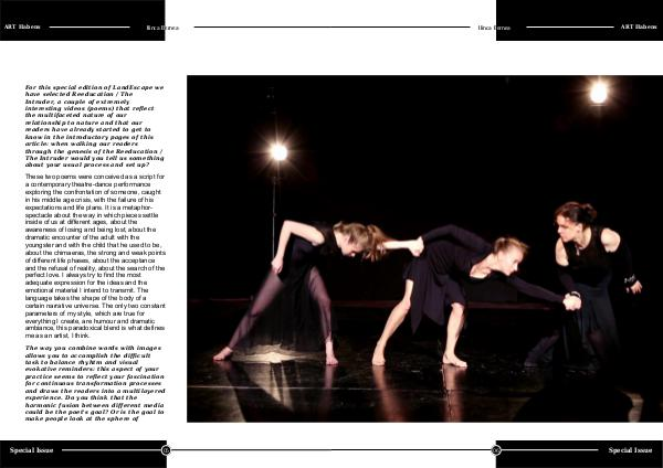 These two poems were conceived as a script for a contemporary theatre-dance performance exploring the confrontation of someone, caught in his middle age crisis, with the failure of his expectations and life plans. It is a metaphorspectacle about the way in which pieces settle inside of us at different ages, about the awareness of losing and being lost, about the dramatic encounter of the adult with the youngster and with the child that he used to be, about the chimaeras, the strong and weak points of different life phases, about the acceptance and the refusal of reality, about the search of the perfect love. I always try to find the most adequate expression for the ideas and the emotional material I intend to transmit. The language takes the shape of the body of a certain narrative universe. The only two constant parameters of my style, which are true for everything I create, are humour and dramatic ambiance, this paradoxical blend is what defines me as an artist, I think.