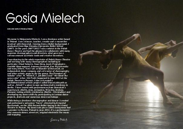 My name is Malgorzata Mielech. I am a freelance artist based in Poland. I am a dancer, teacher, creator and a researcher involved with DanceLab. Coming from a Ballet background, I graduated from Olga Slawska-Lipczynska Ballet School( 2007). In the years 2007? 2012 I was a soloist in the Polish Dance Theatre and had the pleasure to collaborate with many supreme choreographers and directors, what gave me a various amount of artistic tools and creative incentives.