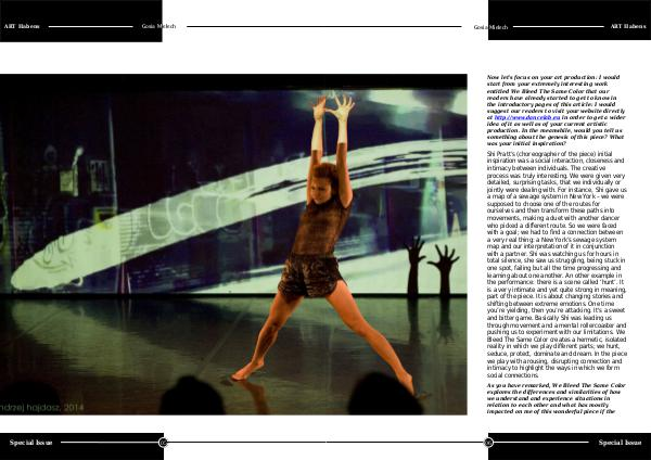 Shi Pratt’ s( choreographer of the piece) initial inspiration was a social interaction, closeness and intimacy between individuals. The creative process was truly interesting. We were given very detailed, surprising tasks, that we individually or jointly were dealing with. For instance, Shi gave us a map of a sewage system in New York – we were supposed to choose one of the routes for ourselves and then transform these paths into movements, making a duet with another dancer who picked a different route. So we were faced with a goal; we had to find a connection between a very real thing: a New York’ s sewage system map and our interpretation of it in conjunction with a partner. Shi was watching us for hours in total silence, she saw us struggling, being stuck in one spot, failing but all the time progressing and learning about one another. An other example in the performance: there is a scene called‘ hunt’. It is a very intimate and yet quite strong in meaning, part of the piece. It is about changing stories and shifting between extreme emotions. One time you’ re yielding, then you’ re attacking. It ' s a sweet and bitter game. Basically Shi was leading us through movement and a mental rollercoaster and pushing us to experiment with our limitations. We Bleed The Same Color creates a hermetic, isolated reality in which we play different parts; we hunt, seduce, protect, dominate and dream. In the piece we play with arousing, disrupting connection and intimacy to highlight the ways in which we form social connections.