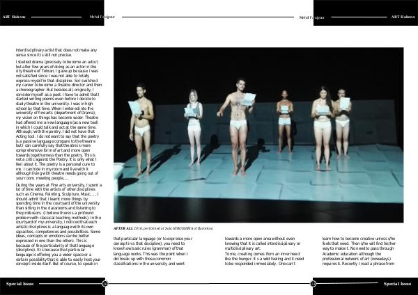 I studied drama( precisely to become an actor) but after few years of doing as an actor in the city theatre of Tehran, I gave up because I was not satisfied since I was not able to totally express myself in that discipline. So I switched my career to become a theatre director and then a choreographer. But besides all, originally, I consider myself as a poet. I have to admit that I started writing poems even before I decide to study theatre in the university. I was in high school by that time. When I entered into the university of fine arts( department of Drama), my vision on things has become wider. Theatre had offered me a new language( as a new tool) in which I could talk and act at the same time. Although, with the poetry, I did not have that Acting tool. I do not want to say that the poetry is a passive language compare to the theatre but I can carefully say that theatre is more comprehensive form of art and more open towards togetherness than the poetry. This is not a critic against the Poetry. It is only what I feel about it. The poetry is a personal cure to me. I can hide in my room and live with it although living with theatre needs going out of your room, meeting people,…