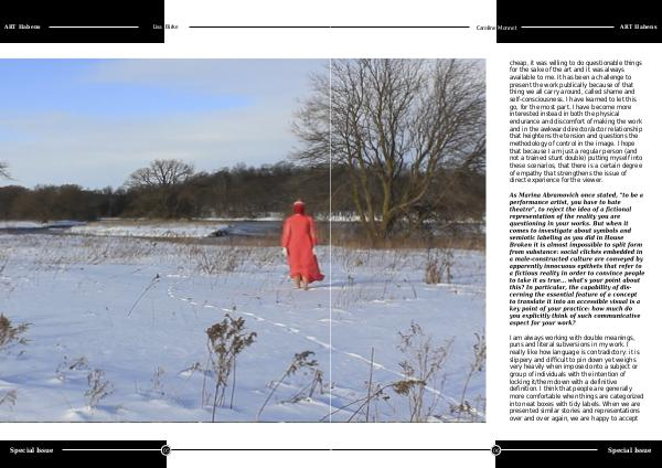 cheap, it was willing to do questionable things for the sake of the art and it was always available to me. It has been a challenge to present the work publically because of that thing we all carry around, called shame and self-consciousness. I have learned to let this go, for the most part. I have become more interested instead in both the physical endurance and discomfort of making the work and in the awkward director / actor relationship that heightens the tension and questions the methodology of control in the image. I hope that because I am just a regular person( and not a trained stunt double) putting myself into these scenarios, that there is a certain degree of empathy that strengthens the issue of direct experience for the viewer.
