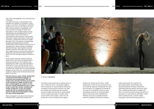 itself. The choreographer in me then becomes a mediator. I normally start with a clear direction that interests me, weather its a feeling, a visual image, a scenario or atmosphere, a personal experience or even just an interest to work with a certain dancer or collaborator. It is never the same. Inspiration comes from everywhere. In the freelance dance scene, unfortunately the development of a work mostly doesn’ t start in the studio or experimenting with materials, those things come later. I never work alone. In dance we are always collaborating with many people. Because of this, the amount of organization, productional preparations and grant confirmations always needs to be done first. In the beginning I really had allot of problems with this because I was impatient and just wanted to get into the studio. Now I have more appreciation for this process because it shapes the way the work will be made and forces the first conceptual steps and ideas to form.