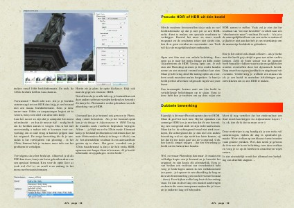 Met de moderne fototoestellen sla je vaak zo veel beeldinformatie op dat je niet per se een HDRreeks dient te maken om speciale resultaten te verkrijgen. Hoewel het meer en meer wordt toegepast en de resultaten zeker niet slecht zijn, ben ik er geen overdreven voorstander van. Toch wil ik je de mogelijkheid niet onthouden. Open een foto met een enkele belichting. Eens open ga je naar het menu Image en klikt onder Adjustements de HDR Toning optie aan. Je zult zien dat Photoshop meteen je foto onder handen neemt en een meestal vreemd resultaat laat zien. Maar je hebt terug dezelfde toning opties als voorheen reeds meerdere malen besproken. Je kunt je beeld perfect afwerken volgens de regels van jouw kunst. Een tussenoptie bestaat eruit om één beeld in verschillende belichtingen op te slaan. Eens je deze hebt kan je trachten om op deze wijze een HDR samen te stellen. Vaak zal je zien dat het resultaat van “net niet hetzelfde” overhelt naar een “absoluut niet mooi” resultaat. En toch… Als je in de onmogelijkheid bent om een reeks te maken of je dacht er niet aan dan heb je een waterkansje om de aanwezige beeldinfo te gebruiken. Hoe je het echter ook draait of keert – als je werkt met één beeld ga je altijd ergens een zeker verlies kennen. Zelfs de beste sensor van dit moment heeft bepaalde vlakken waarin zijn mogelijkheden worden overtroffen door het dynamisch bereik. Diep zwart bevat geen beeldinfo en uitgebrand wit evenmin. Verder krijg je wellicht een massa ruis als je een beeld in meerdere belichtingen gaat ontwikkelen om zo een HDR te maken.