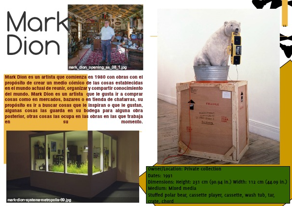 Mark Dion es un artista que comienza en 1980 con obras con el propósito de crear un medio cómico de las cosas establecidas en el mundo actual de reunir, organizar y compartir conocimiento del mundo. Mark Dion es un artista que le gusta ir a comprar cosas como en mercados, bazares o en tienda de chatarras, su propósito es ir a buscar cosas que le inspiran o que le gustan, algunas cosas las guarda en su bodega para alguna obra posterior, otras cosas las ocupa en las obras en las que trabaja en su momento.