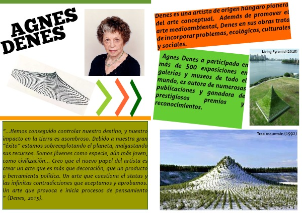 “...Hemos conseguido controlar nuestro destino, y nuestro impacto en la tierra es asombroso. Debido a nuestra gran “éxito” estamos sobreexplotando el planeta, malgastando sus recursos. Somos jóvenes como especie, aún más joven, como civilización... Creo que el nuevo papel del artista es crear un arte que es más que decoración, que un producto o herramienta política. Un arte que cuestiona el status y las infinitas contradicciones que aceptamos y aprobamos. Un arte que provoca e inicia procesos de pensamiento “ (Denes, 2015).