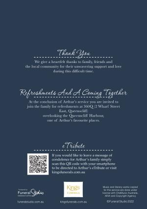 At the conclusion of Arthur ’ s service you are invited to join the family for refreshments at 360Q ( 2 Wharf Street East , Queenscliff ) overlooking the Queenscliff Harbour , one of Arthur ’ s favourite places .