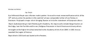 Repin studied painting in Sant Peterburg Art Academy. His major works include Barge Haulers on