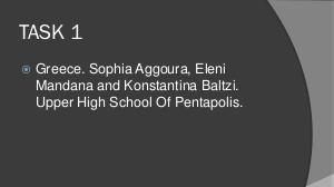 TASK 1 Greece. Sophia Aggoura, Eleni Mandana and Konstantina Baltzi. Upper High School Of Pentapolis.