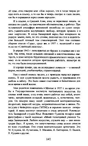 Мои родители поженились в Москве в 1937 г. во время учебы в Государственном институте театрального искусства. По словам моей мамы, отец очень много работал над собой, много читал, интересовался музыкой, живописью, и, естественно, театром. Он покорил маму своей удивительной восторженностью, щедростью, широтой натуры, непритязательностью в жизни. Папа ушел с четвертого курса ГИТИСа и серьезно занялся литературой. А мама институт закончила и стала актрисой. Руководитель Балкарской студии Илья Яковлевич Судаков подарил маме фотографию с такой надписью: « Моей талантливой ученице Тамаре Залихановой. Любите искусство, служите ему— оно вознаградит Вас ». Я думаю, эти напутственные слова можно отнести ко всем студийцам. Они стали замечательными артистами. Это М. Кучуков, Ш. Кучмезова, 3. Махиева, А. Биттирова, О. Бадаев, X. Кудаев и другие.