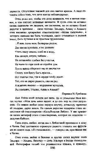 ... Я вам, сыны мои, балкарцы родом, Дал имена крестьян, и вы должны Чтить нашу землю, хлеб ее и воду, Как пахари, ашуги, чабаны... Не оставляйте слабых без участья, На чьем-то горе свой не стройте дом. Пусть жизнь обережет вас от несчастья Соседу или брату быть врагом... Нет счастья там, где в сердце злобу носят. Тот, кто не дарит радость, сам не рад. А в ваших именах— шуршание колосьев, Вы слышите, Эльдар, Алим и Азамат?