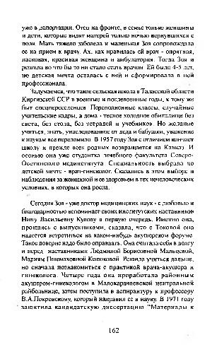 Задумаемся, что такое сельская школа в Таласской области Киргизской ССР в военные и послевоенные годы, к тому же быт спецпереселенцсв. Переполненные классы, случайные учительские кадры, а дома- тесное холодное обиталище без света, без стола, без тетрадей и учебников. Но желание учиться, знать, унаследованное от деда и бабушки, уважение к наукам все переломило. В 1957 году Зоя с отличием кончает школу и прежде всех родных возвращается на Кавказ. И осенью она уже студентка лечебного факультета Северо- Осетинского мединститута. Специальность выбрала по детской мечте- врач-гинеколог. Сказались в этом выборе и наблюдения за женщиной и ее здоровьем в тех нечеловеческих условиях, в которых она росла.