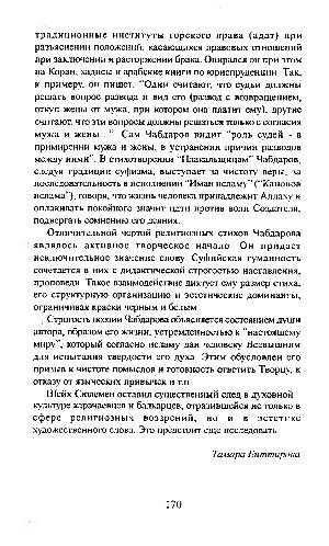 традиционны е институты горского права( адат) при разъяснении положений, касающихся правовых отношений при заключении и расторжении брака. Опирался он при этом на Коран, хадисы и арабские книги по юриспруденции. Так, к примеру, он пишет:“ Одни считают, что судьи должны решать вопрос развода и вид его( развод с возвращением, откуп жены от мужа, при котором она платит ему), другие считают, что эти вопросы должны решаться только с согласия мужа и ж ены...”. Сам Чабдаров видит“ роль судей- в примирении мужа и жены, в устранении причин разводов между ними”. В стихотворении“ Плакальщицам” Чабдаров, следуя традиции суфизма, выступает за чистоту веры, за последовательность в исполнении“ Иман исламу”(“ Канонов ислама”), говоря, что жизнь человека принадлежит Аллаху и оплакивать покойного значит идти против воли Создателя, подвергать сомнению его деяния.