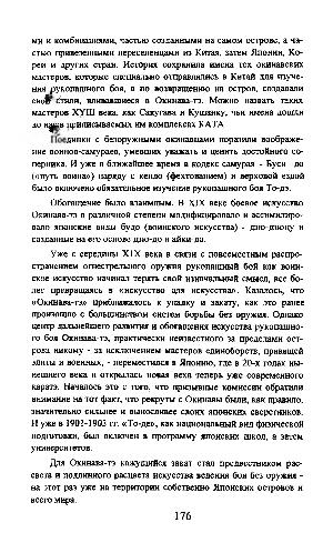 ми и комбинациями, частью созданными на самом острове, а частью привезенными переселенцами из Китая, затем Японии, Кореи и других стран. История сохранила имена тех окинавских мастеров, которые специально отправлялись в Китай для изучения ^рукопашного боя, а по возвращению на остров, создавали своАг йили, вливавшиеся в Окинава-тэ. Можно назвать таких мастеров XYIII века, как Сакугава и Кушанку, чьи имена дошли