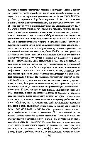 которыми вместе постигаем воинское искусство. Дети с малых лет растут в такой атмосфере, видят моих друзей, многие из которых достигли серьезных успехов в жизни, в том числе благодаря боксу, спортивной борьбе и каратэ-до. Сейчас же, конечно, намного легче, даже в тренировках, ибо уже дети помогают нам. И меня радует, что они понимают главные ценности Каратэ-до. Я не ставил целью учить детей, особенно девочек, именно поединкам. Но им очень нравятся и поединки и технические упражнения, а это соответствует заповеди Мабуни- сенсея о возможности совершенствования искусства поединка-кумитэ только через ката. Без совершенствования техники в ката и в бункай-кумитэ( отработка элементов ката с партнерами) не может быть каратэ-до. В тех « стилях » и « школах », которые не могут в силу отрыва от традиционной школы постигать глубину КАТА( от мантрических элементов до энергетических и физических аспектов воздействия на занимающегося), нет ничего от каратэ-до, и даже от его одной грани- каратэ-дзюцу. Беда псевдошкол в том, что они выдают за воинское искусство некую систему гимнастических упражнений и нескольких, я хотел бы подчеркнуть, что лишь нескольких да эффективных приемов, заимствованных из каратэ-дзюцу, и которые может применить лишь человек, находящийся в очень хорошей физической форме. Но человек отличной физической кондиции особо и не нуждается ни в каких дополнительных упражнениях, а сила, быстрота и выносливость, как правило, присущи молодому возрасту, имеющему неприятнейшую особенность- проходить. К тому же при неправильных тренировках подрывается здоровье, порой калечатся молодые и дерзкие, в хорошем смысле, ребята. Когда приезжают сенсеи, которым далеко за шестьдесят лет, и четырех-пятичасовую тренировку работают вместе с тобой так, что ты чувствуешь себя начинающим школьником даже в общефизической подготовке, не говоря уж о кумитэ и ката- вот это школа. Каратэ-до учит правильно дышать, смотреть, мобилизовать силы и внимание. В традиционной школе можно любого человека сделать мастером— это дело лишь его настойчивости и времени, кому-то для этого достаточно нескольких лет, а кому-то- десятилетий. Если Вас кто-то завлекает тем, что у него- традиционное каратэ, но добавляет- « жесткое », контактное, а все остальное, мол, неэффективно, бегом забирайте оттуда Вашего ребенка, пока его не покалечили. Каратэ-до нико