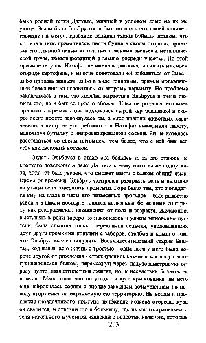 быка родной тетки Далхата, жившей в угловом доме на их же улице. Звали быка Эльбрусом и был он под стать своей кличке- громаден и могуч, вдобавок обладал таким буйным нравом, что его владелице приходилось пасти буяна в своем огороде, привязав его длинной цепью из толстых стальных звеньев к металлической трубе, в бетонированной в землю посреди участка. По этой причине тетушка Назифат не имела возможности сажать на своем огороде картофель, и многие советовали ей избавиться от быка- либо продать живьем, либо в виде говядины, причем подавляющее большинство склонялось ко второму варианту. Но проблема заключалась в том, что хозяйка вырастила Эльбруса и очень любила его, да и бык ее просто обожал. Едва он родился, его мать пришлось зарезать- она подавилась сырой картофелиной и скорее всего просто задохнулась бы, а мясо павших животных карачаевцы в пищу не употребляют- и Назифат выкормила сироту, используя бутылку с импровизированной соской. Ей не хотелось расставаться со своим питомцем, тем более, что с ней бык вел себя как ласковый котенок.