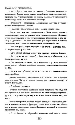После того, как они познакомились, Надя вновь занялась кроссвордами, даже не заметив возмущенного взгляда Феликса, очень недовольного столь бесцеремонным вторжением в его беседу с Далхатом. Она еще несколько раз обращалась к новому знакомому и без промедления получала правильный ответ.