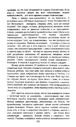 Люди к Аушеву прислушиваются, но им тревожно. В республике около 200 тысяч беженцев из Чечни, большинство из них беспомощны- женщины, старики, дети, куда им дальше бежать? Эта цифра, кстати, федеральными властями тоже оспаривалась, пока не приехала комиссия и не пересчитала. Сейчас, говорит председатель правительства Ахмед Мальсагов, официально зарегестрировано 172 тысячи « временно перемещенных », на скромный бюджет республики тоже не малая нагрузка. Свет, газ, коммуникации- все это федеральный центр не оплачивал. Питание оплачивает- 15 рублей в сутки на человека. Это один раз в день тарелка супа и хлеб. Мальсагов сказал, что вынужден предупредить: с этого понедельника хлеба и горячей пищи не будет Москва не перевела деньги, только за хлеб республика задолжала 40 миллионов, пекарням нечем платить за муку. Так уже было в феврале, но тогда все удалось уладить. Сейчас миграционную службу хотят объединить с Миннацем. В очереди к пищеблоку только об этом и говорят.