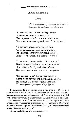 Емельянов Юрий Витальевич родился в 1953 год \ в подмосковных Люберцах. После десятилетки в 1976 году закончил механико-математичсо. ий факультет МГУ им. Ломоносова, а в 1981 году- аспирантуру этого же факультета. Имеет штучные публикации. Ныне занимается проблемами информатизации производства и управления, увлекается литературным творчеством. Выпустил сборник стихов“ Простая геометрия” и научно-художественнмо книгу“ Золотые ворота в рай”.