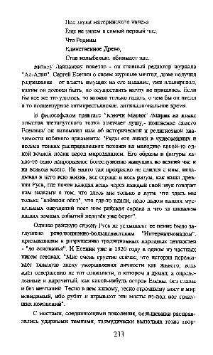 Однако райскую сирену Русь не услышала: ее пение было заглушено революционно-большевистским " Интернационалом ", призывавшим к разрушению традиционных народных ценностей- " до основанья ". И Есенин уже в 1920 году в одном из частных писем сетовал: " Мне очень грустно сейчас, что история переживает тяжелую эпоху умерщвления личности как живого, ведь идет совершенно не тот социализм, о котором я думал, а определенный и нарочитый, как какой-нибудь остров Елены, без славы и без мечтаний. Тесно в нем живому, тесно строящему мост в мир невидимый, ибо рубят и взрывают эти мосты из-под ног грядущих поколений ".