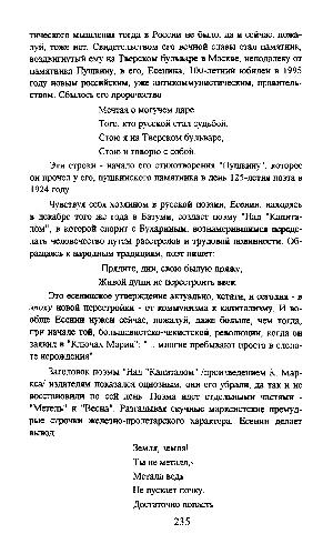 тического мышления тогда в России не было, да и сейчас, пожалуй, тоже нет. Свидетельством его вечной славы стал памятник, воздвигнутый ему на Тверском бульваре в Москве, неподалеку от памятника Пушкину, в его, Есенина, 100-летний юбилей в 1995 году новым российским, уже антикоммунистическим, правительством. Сбылось его пророчество:
