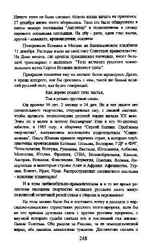 Он прожил 30 лет, 2 месяца н 24 дня. Но и тех десяти лет сознательного творчества, отпущенных ему, с лихвой хватало, чтобы написать энциклопедию русской жизни начала XX века. Этим он и велик и потому бессмертен! Еще к его 90-летнему юбилею, в 1985 году, в сборнике " Сергей Есенин. Проблемы творчества ", выпущенном московским издательством " Современник ", Ольга Юшина привела перечень стран, в которых опубликованы произведения Есенина: Польша, Болгария, ГДР и ФРГ, Чехословакия, Венгрия, Румыния, Вьетнам, Югославия, Албания, Монголия, Италия, Франция, США, Великобритания, Канада, Австрия, Испания, Финляндия, Норвегия, Швеция, Япония, Нидерланды и некоторые страны Азии и Африки: Афганистан, Турция, Египет, Иран, Ирак. Распространение есенинского наследия- пошлине планетарно!