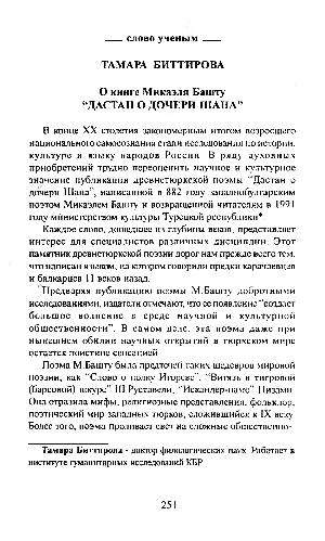 В конце XX столетия закономерным итогом возросшего национального самосознания стали исследования по истории, культуре и языку народов России В ряду духовны х приобретений трудно переоценить научное и культурное значение публикации древнетюркской поэмы“ Дастан о дочери Ш ана”, написанной в 882 году западнобулгарским поэтом Микаэлем Башту и возвращенной читателям в 1991 году мйнистерством культуры Турецкой республики *.