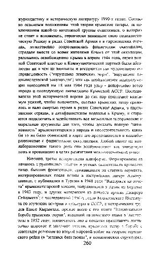 Наконец, третья историческая платформа. Формирование ее началось с рукописных заметок и устных свидетельств крымских татар, бывших фронтовиков, сражавшихся на стороне вермахта, интернированных после войны в австрийском лагере Альбершвенде; с публикации в Турции в 1948 году " Выдержек из отчета " крымскотатарской миссии, направленной в Крым из Берлина в 1943 году, и других материалов из личного архива Джафера Сейдамета3; с исследований 1950-х годов Мюнхенского Института по изучению истории и культуры в СССР, с исторических трудов Едиге Кырымала, прежде всего с его книге " Национальная борьба крымских тюрок ", изданной на немецком языке в Эмсдеттене в 1952 году; заключалось оно б попытке представить достаточно широкое и массовое участие крымских татар в борьбе с советским режимом во второй мировой войне на стороне германского рейха( в " зеленых батальонах ", в политических структурах,