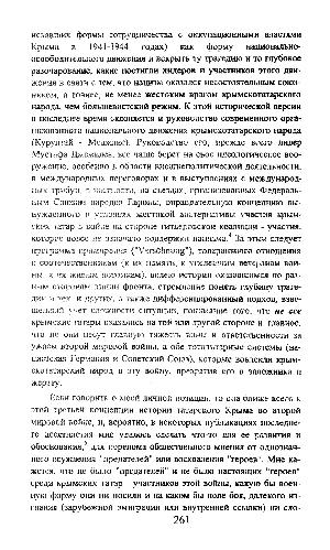 искавших формы сотрудничества с оккупационными властями Крыма в 1941-1944 годах) как форму национальноосвободительного движения и вскрыть ту трагедию и то глубокое разочарование, какие постигли лидеров и участников этого движения в связи с тем, что нацизм оказался несостоятельным союзником, а точнее, не менее жестоким врагом крымскотатарского народа, чем большевистский режим. К этой исторической версии в последнее время склоняется и руководство современного организованного национального движения крымскотатарского народа( Курултай- Меджлис). Руководство его, прежде вгего лидер Мустафа Джемилев, все чаще берет на свое идеологическое вооружение, особенно в области внешнеполитической деятельности, в международных переговорах и в выступлениях с международных трибун, в частности, на съездах, организованных Федеральным Союзом нарсдоз Европы, оправдательную концепцию вынужденного в условиях жестокой альтернативы участия крымских татар в войне на стороне гитлеровской коалиции- участия, которое вовсе не означало поддержки нацизма. 4 За этим следует программа примирения(" Versöhnung "), толерантного отношения к соотечественникам( к их намята, к уцелевшим ветеранам войны, к их живым потомкам), волею истории оказавшимся по разным сторонам линии фронта, стремление понять глубину трагедии и тех. и других, а также дифференцированный подход, взвешенный учет сложности ситуации, поникание того, что не все крымские татары оказались на той или другой стороне и, главное, что не они несут главную тяжесть вины и ответственности за ужасы второй мировой войны, а обе тоталитарные системы( нацистская Германия и Советский Союз), которые вовлекли крымскотатарский народ в эту войну, превратив его в заложника и жертву.