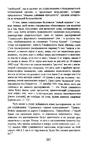 О том, каким социальным бедствием " новый порядок " с самых первых дней своего утверждения оборачивался для крымчан( и в том числе, безусловно, для крымских татар, составлявших в 1941 году почти четверть гражданского населения полуострова), красноречиво свидетельствует одно из первых распоряжений " Германского Верховного командования "( так- в русском тексте), опубликованное на страницах " Голоса Крыма ". 7 Согласно этому распоряжению, жители Симферополя были обязаны сдать(" для последующего распределения поровну "!) все " запасы и излишки ", а именно зерно и муку, жиры( тут же педантично разъяснялось, что речь идет о любых видах растительного и животного масла) и сахар, если кто-то имел " свыше 2 кг жиров, свыше 2 кг сахара и свыше 40 кг зерна или муки из расчета до 30 апреля 1942 года ". Из этого не совсем внятного " расчета " все же с достаточной очевидностью следовало, что речь идет о крайнем продовольственном минимуме, едва дававшем возможность продержаться до весны следующего года( что такое 2 кг сахара или 2 кг масла на пять месяцев жизни?-14 грамм в день на человека- тюремная, почти смертельная норма!). Срок сдачи " излишков " устанавливался под Новый год- 31 декабря 1941 года, после чего, как следовало из данного распоряжения, "... кто после указанного срока будет иметь запас продуктов, превышающий установленную норму, или, зная о существующих запасах продовольствия [ своих соседей ], не сообщит об этом, будет наказан смертью [ курсив мой- С. Ч.]".