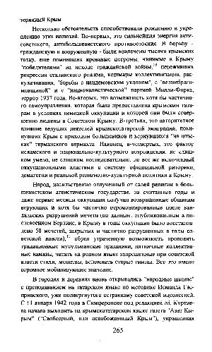 Несколько обстоятельств способствовали рождению и укреплению этих иллюзий. Во-первых, это сильнейшая энергия антисоветского, антибольшевистского противостояния. В борьбу- гражданскую и вооруженную- были вовлечены тысячи крымских татар, еще помнивших кровавые погромы, чинимые в Крыму " победителями " на исходе гражданской войны, 10 переживших репрессии сталинского режима, кошмары коллективизации, раскулачивания, " борьбы с нацдемовским уклоном ", с " велиибрагимовщиной " и с " националистической " партией Милли-Фирка, террор 1937 года. Во-вторых, это возможность хотя бы частичного самоуправления, которая была предоставлена крымским татарам в условиях немецкой оккупации и которой они были совершенно лишены в Советском Крыму. В-третьих, это авторитетное влияние ведущих деятелей крымскотатарской эмиграции, покинувших Крым с приходом большевиков и вернувшихся " на штыках " германского вермахта. Наконец, в-четвертых, это фактор исламского и национально-культурного возрождения, не слишком умело, не слишком последовательно, но все же включенный оккупационными властями в систему официальной риторики, демагогии и реальной религиозно-культурной политики в Крыму.