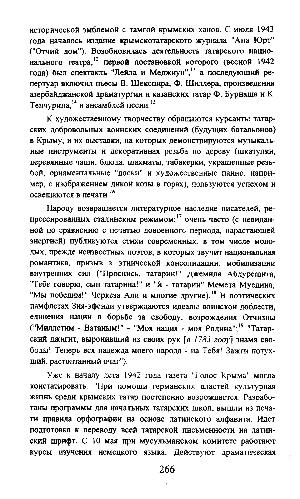 исторической эмблемой с тамгой крымских ханов. С июля 1943 года началось издание крымскотатарского журнала " Ана Юрт "(" Отчий дом "). Возобновилась деятельность татарского национального театра, 12 первой постановкой которого( весной 1942 года) был спектакль " Лейла и Меджнун ", 13 а последующий репертуар включил пьесы В. Шекспира, Ф. Шиллера, произведения азербайджанской драматургии и казанских татар Ф. Бурнаша и К. Тенчурина, 14 и ансамблей песни. 15