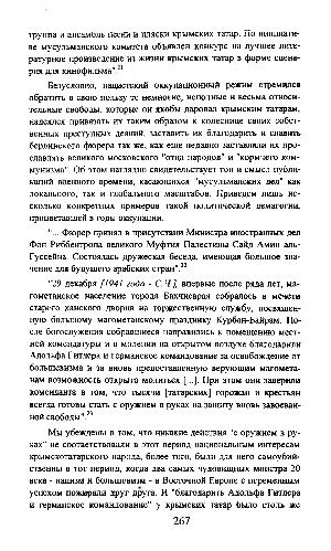 Безусловно, нацистский оккупационный режим стремился обратить в свою пользу те немногие, неполные и весьма относительные свободы, которые он якобы даровал крымским татарам, надеялся привязать их таким образом к колеснице своих собственных преступных деяний, заставить их благодарить и славить берлинского фюрера так же, как еше недавно заставляли их прославлять великого московского " отца народов " и " кормчего коммунизма ". Об этом наглядно свидетельствует тон и смысл публикаций военного времени, касающихся " мусульманских дел " как локального, так и глобального масштабов. Приведем лишь несколько конкретных примеров такой политической демагогии, процветавшей в годы оккупации.