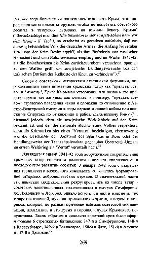 1941-42 года большевики попытались отвоевать Крым, этот народ спонтанно взялся за оружие, чтобы не допустить советского десанта в татарских деревнях на южном берегу Крыма "(" Bertlcksichtigt man dies [ die Situation in der sowjeti-schen Krim vor dem Krieg- S. Tsch.}, so erscheint es geradezu nattlrlich, dap ein derartig behandeltes Volk die deutsche Armee, die Anfang November 1941 von der Krim Besitz ergriff, als ihre Befreierin von mssischer Herrschaft und vom Bolschewismus empfmg und im Winter 1941 / 42, als die Bolschewisten die Krim zurUckzuerobem versuchten, spontan zu den Waffen griff, um sowjetische Landungsversuche bei den ttlrkischen Dörfem der Südküste der Krim zu verhindem ")/ 7