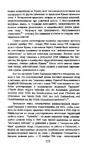 Своего апогея антитатарская политика оккупантов достигла в акциях декабря 1943- января 1944 годов, когда 128 татарских аула в горном Крыму и на южном берегу Крыма были планомерно уничтожены( сожжены) за мнимое или действительное " пособничество " их жителей советским партизанам. Десятки тысяч крымских татар оказались в результате этой операции без имущества, без крова и подверглись принудительному переселению в северные, степные районы Крыма. 37 После этого многие крымские татары, действительно, стали уходить в советские партизанские отряды, сражавшиеся в горах.