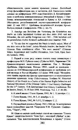 общественности, среди многих крымских ученых. Достойный отпор фальсификаторам дал, в частности, Д. В. Омельчук в своем докладе на конференции 199S года( Омельчук Д. Коллаборационизм и проблемы межнациональных отношений в Крыму // Проблемы межнациональных отношений в Крыму в XX столетии( Материалы республиканской научно-практической конференции). 25 мая 1995 г. Проблемы политической истории Крыма. Выпуск первый. Симферополь 1996. С. 26-27).