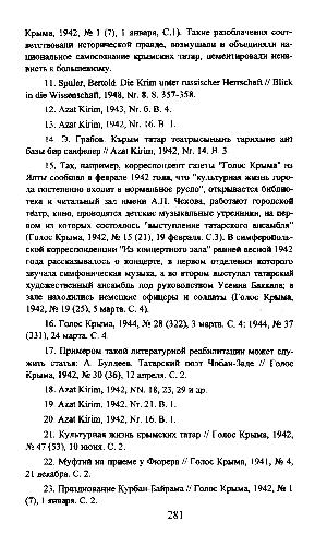 11. Spuler, Bertold. Die Krim unter russischer Herrschaft // Blick in die Wissenschaft, 1948, Nr. 8. S. 357-358. 12. Azat Kirim, 1943, Nr. б. B. 4. 13. Azat Kirim, 1942, Nr. 16. В. 1.