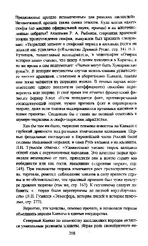Как бы там ни было, тюркские племена известны на Кавказе с глубокой древности под разными этническими названиями. Первые феодальные государства в Европейской части России были созданы западными тюрками, и сама Русь входила в их каганаты. JI. H. Гумилев отмечал: « Удивительно умение тюрок находить общий язык с окружающими народами. Это качество тюрки проявляли независимо от того, приходили они в новую страну как победители или как гости, наемники »(« Древние тюрки », стр. 149). При господстве тюрков отмечается рост градостроительства, торговли, ремесел, соблюдение законов в силу крепости страны и то обстоятельство, что « расовый принцип был чужд пультуре древних тюрков »( там же, стр. 163). К сказанному следует добавить: «.. тюрки были веротерпимы до полной неразборчивости »( Л. Н. Гумилев « Этносфера, история людей и история природы », стр. 373).