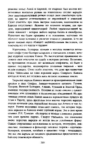 Тюркские народы Кавказа являются правопреемниками своих предков в лице Скифии, Западно-лоркского каганата, Гуннии, Хазарин, Великой Болгарии, Алании, Куманни и Золотой Орды, имевших государственность. История их тесно связана с существованием этих племенных и политических объединений На протяжении многих веков Кавказ являлся перевалочным пунктом из Азии в Европу, здесь пролегали пути многих тюркских народов, отсюда начинали свои европейские походы хан Аттила и хан Аспарух. Ранние источники позволяют считать, что история тюркских народов на Кавказе имеет глубокие корни. Эго в свое время отметил Л. Н. Гумилев: « Балкарцы и чуваши сложились раньше, чем сами древние тюрки ». Следует учитывать, что этнические имена тюркских народов не всегда имели устойчивую форму. Однако современные исследования по истории, этнографии, лингвистике, топонимии и фольклору западных тюрков- карачаевобалкарцев, кумыков, ногайцев и крымских татар- показывают, что все эти народы до позднего средневековья представляли собой одну этническую общность.