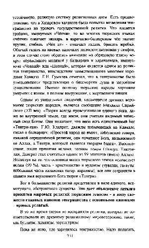 устойчивую, развитую систему религиозных догм. Есть предположение, что в Хазарском каганате была попытка возведения тенгрианства на уровень государственной религии. Что касается гробниц, именуемых « Чёпчи », то во многих тюркских языках « чёпчи » означает знахарь, в карачаево-балкарском чёп значит прутик, стебель. « Чёп ат »- означает гадать, бросать жребий. Обычай гадать на ивовых палочках засвидетельствован у скифов, в этом случае стоит обратить внимание на обрядовую пляску вокруг пораженного молнией у балкарцев и карачаевцев, именуемую « Чоппай » или « Цоппай », которая является одним из реликтов тенгрианства, впоследствии заимствованного многими народами Кавказа. J1. H. Гумилев отмечал, что в тенгрианстве было утвердившееся представление о бессмертии души и загробном существовании. Именно поэтому тюркские народы хоронили умерших с конём, в полном вооружении, с жертвенной пищей.