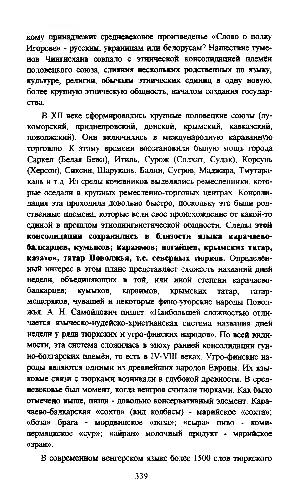 В XII веке сформировались крупные половецкие союзы( лукоморский, приднепровский, донской, крымский, кавказский, поволжский). Они включились в международную караванную торговлю. К этому времени восстановили былую мощь города Саркел( Белая Бежа), Итиль, Сурож( Солхат, Судак), Корсунь( Херсон), Сиксин, Шарукань, Балин, Сугров, Маджара, Тмутаракань и т. д. Из среды кочевников выделялись ремесленники, которые оседали в крупных ремесленно-торговых центрах. Консолидация эта проходила довольно быстро, поскольку это были родственные племена, которые вели свое происхождение от какой-то единой в прошлом этнолингвистической общности. Следы этой консолидации сохранились в близости язы ка карачаевобалкарцев, кумыков; караимов; ногайцев, крымских татар, казахов, татар Поволжья, т. е. северных тюрков. Определённый интерес в этом плане представляет схожесть названий дней недели, объединяющих в той, или иной степени карачаевобалкарцев; кумыков, караимов, крымских татар, татармещеряков, чувашей и некоторые фино-угорские народы Поволжья. А. Н. Самойлович пишет: « Наибольшей сложностью отличается языческо-иудейско-христианская система нзчвяния дней недели у ряда тюркских и угро-финских народов ». По всей видимости, эта система сложилась в эпоху ранней консолидации гунно-болгарских племён, то есть в IV-VIII веках. Угро-финские народы являются одними из древнейших народов Европы. Их языковые связи с тюрками возникали в глубокой древности. В средневековье был момент, когда венгров считали тюрками. Как было отмечено выше, пища- довольно консервативный элемент. Карачаево-балкарская « сохта »( вид колбасы)- марийское « сохта »; « боза » брага- мордвннское « поза »;, « сыра » пиво- комипермяцкское « сур »; « айран » молочный продукт- марийское « эран ».
