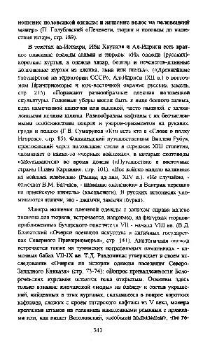В текстах ал-Истахри, Ибн Хаукаля и Ал-Идриси есть краткое описание одежды славян и тюрков: « Их одежда( русских)- короткие куртки, а одежда хазар, болгар и печенегов-длинные долгополые куртки из хлопка, льна или шелка ».(« Древнейшие государства на территории СССР », Ал-Идриси( XII в.) о восточном Причерноморье и юго-восточной окраине русских земель, стр. 215). « Поражают разнообразные одеяния половецкой скульптуры. Головные уборы могли быть в виде боевого шлема, едва намеченной шапочки или высокой, часто пышной, с заломленными полями шляпы. Разнообразны кафтаны с их бесчисленными особенностями покроя и узоров-орнаментов на рукавах, груди и полах »( Г. В. Сумаруков « Кто есть кто в « Слове о полку Игореве », стр. 85). Фламандский путешественник Виллем Рубук, проезжавший через половецкие степи в середине XIII столетия, упоминает о каких-то « черных войлоках », в которые скотоводы « закутываются » во время дождя(« Путешествие в восточные страны Плано Карпини », стр. 101). « Все войско надело валянные из войлока кепенеки »( Рашид ад-дин, XIV в.). « Не случайно,- отмечает В. М. Батчаев,- название « кепенеки » в Венгрии перешло на армейскую шинель »( кьепъенегн). В русских летописях упоминаются япанчи, это- джамчи, замычи( бурка).