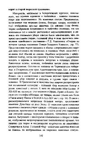 Материалы, найденные в Белореченских курганах, показывают, что мужчин хоронили в тюбетейках- нижнем головном уборе или подшлемниках. На каменных статуях Предкавказья, оставленных там тюрками( гунны, болгары, хазары, половцы и т. д.) изображены круглые шапочки. По мнению Гезы Фехер, тюрки изображали погребенного в тюбетейке( колпаке), так как показывали его в момент ритуального жертвоприношения, а лишить его головного убора совсем было невозможно, ибо, по представлениям тюрок, головной убор и пояс являлись символами « свободного состояния »( Т. Д. Равдоникас « Очерки по истории одежды населения Северо-Западного Кавказа », стр. 77). Представления тюрок сказались в обычае северокавказских народов присутствовать на похоронах в головном уборе, поскольку с исламом этот обычай не связан. Подобное встречается у придунайских болгар, когда они просили у папы Николая 1 разрешения входить в церковь и исполнять литургию в головных уборах. Войлочные шляпы, колпаки, тюбетейки имели очень широкое распространение. Остатки их найдены на Черноморском побережье, в Ставропольском крае, Краснодарском крае, КБР, в курганных захоронениях. С мамлюками шапочка-подшлемник попала в Египет, где в соответствии с местными вкусами превратилась в головной убор юношей и девушек, в Грузию через сванов- « сванка ». В Предкавказье и Поволжье был широко распространён так называемый калансуву- головной убор волжских болгар и русов, известный с начала X века по описанию Ибн-Халана. В XII-XIII вв. калансуву стал модным в Иране, Ираке и Египте. Носили его « халифы-аббасиды, их визири, кадии »( Амин аль-Холи « Связи между Нилом и Волгой в XHI-XIV вв.», стр. 16). В связи с рассматриваемыми вопросами большой интерес представляет памятник Дука-Бека на реке Этоке. О тюркском происхождении памятника свидетельствует одежда- стёганая куртка с длинными рукавами, простеганная не поперек, а вдоль руки( что характерно для стёганой одежды тюркских народов), напоминая казахский камзол, бьпующий с некоторыми изменениями в покрое и поныне, изображение непропорционально уменьшенному оружию, что типично для тюрок и неоднократно встречается на памятниках Семиречья и Алтая. Головной убор- войлочная шапочка известна на Кавказе по изображениям на тюркских каменных статуях.