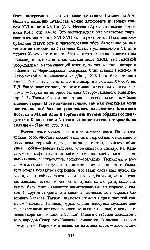 Русский язык весьма насыщен заимствованиями. По фонетическим особенностям можно выделить тюркизмы, относящие к названиям верхней одежды: « штаны »-иштон, « войлок »-ойма, уйма, « юбка »- « юфка »( впервые упоминается в словаре М. Кашгарского), кафтан-къаптал, кобеняк-гебенек, клобук-колбак, колпак-къалпак, шапка-жапха, архалук-аркъалык. Тюркизмы в русском языке давно изучены, но вместе с тем, для простого обывателя может показаться странным, что такие слова как: чулок, казакин, халат, каблук, тулуп, сапог, сарафан, балахон, кайма, чувяки, башмак, тесьма, жилет, кепка, армяк, шлык, фата, кольчуга, кумач, бязь, тент- являются заимствованиями из тюркских языков. С другой стороны, это влияние наблюдается у народов Северного Кавказа. Такими являются элементы традиционной кавказской одежды: башлык, бурка, кафтан, наборные мужские пояса, наколенные повязки, войлочные шляпы( калпак) и кепки, гебенек( короткий войлочный плащ). Сапоги с твёрдой подошвой у всех народов Северного Кавказа называются « башмак », со швом- « чарыюь ». Тюркскими являются названия шубы- « тон », « тен »,