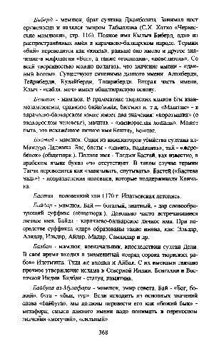 Байбуга аз-Музафари- мамлюк, эмир совета. Бай- « Бог, божий », бута- « бык, тур ». Если исходить из основных значений слова « байбуга », мы должны перевести его как « божий бык »- метафора; смысл данного имени надо понимать в переносном значении « могучий », « сильный ».