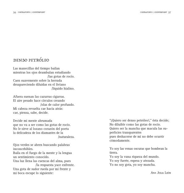 “¡ Quiero ser denso petróleo !,” ésta decide ; No diluible como las gotas de rocío . Quiero ser la mancha que macula las superficies transparentes pues deshacerse de mí no debe ocurrir cómodamente .