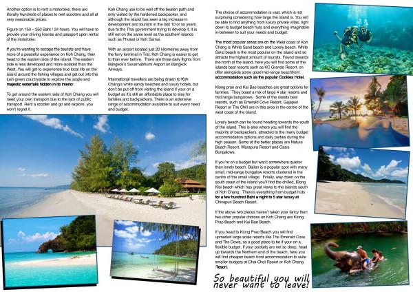 Ifyou’ reonabudgetbutwan’ tsomewherequieter thanlonelybeach, Bailanisapopularspotwithmany smal, mid-rangebungalowresortsclusteredinthe centreofthesmalvilage. Finaly, waydownonthe southcoastoftheislandyou’ lfindthechiled, Klong Kloibeachwhichhasgreatviewstotheislandssouth ofKohChang. There’ severythingfrom budgethuts forafewhundredBahtanightto5starluxuryat ChivapuriBeachResort.